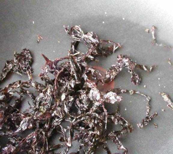 第2步、紫菜用小火炒一下,成為酥脆的海苔,晾涼後揉碎備用