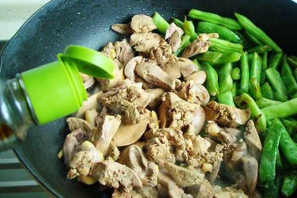 7、加生抽翻炒出香味,再把豆角和雞肝翻炒均勻出香味。