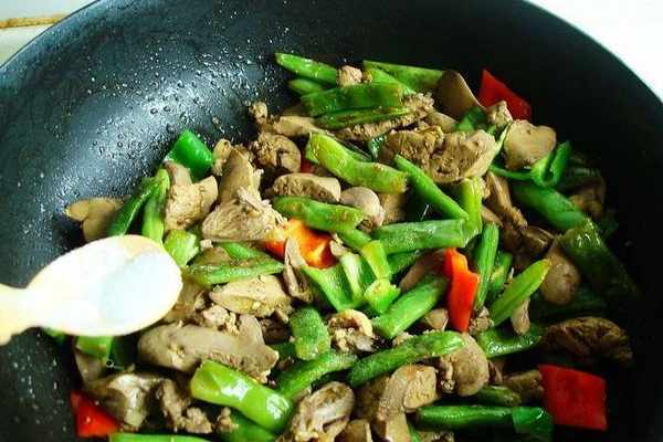 9、再次加少許鹽翻炒均勻出香味,這樣辣椒和雞肝更入味。