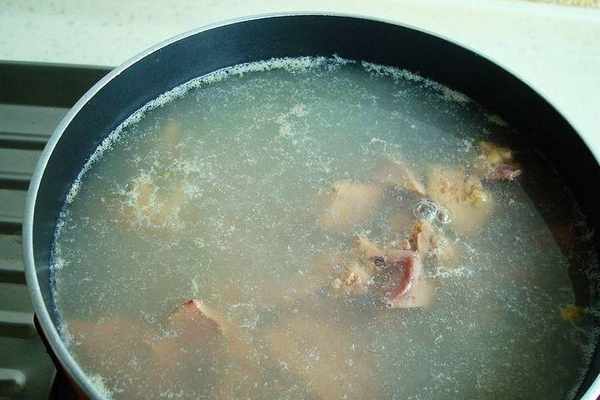 3、把雞肝下開水裡,加料酒煮開撈起,用涼水清洗血沫,撈起瀝幹水分