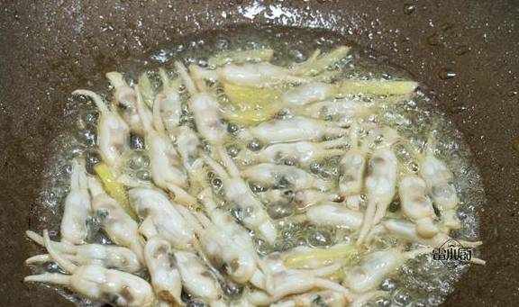 4、起鍋放油,先放生薑,大蒜煸香,再倒入蟶子翻炒幾下。
