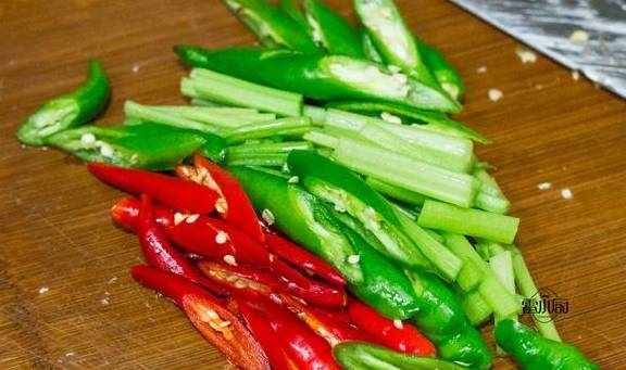 2、把青椒,芹菜,小米椒,都洗幹凈,切成長段待用。