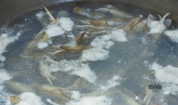3、燒一鍋水,水開之後,倒入蟶子,料酒一起煮開,撈出過冷水沖洗幹凈,把肉剝出來,這樣老少皆宜。
