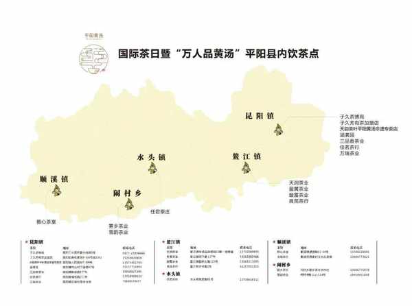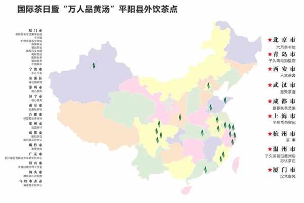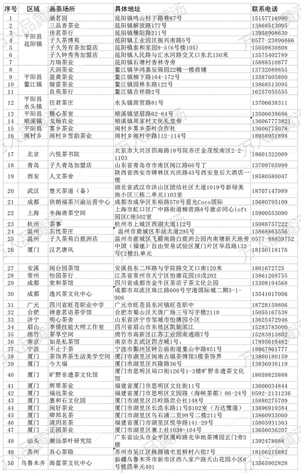 此次集中品鑒的活動點覆蓋平陽縣內及全國各地,縣內包括昆陽、鰲江、水頭、順溪、鬧村等5個鄉鎮的16個品茶場所,縣外包括北京、青島、西安、武漢、成都、上海、杭州、溫州、廈門、安溪、常州、廣元、合肥、濟寧、眉山、綿竹、南京、寧波、汕頭、蘇州、烏魯木齊等21個城市的34個茶館。