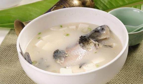 鯽魚去鱗、腸雜,抹上酒,鹽漬10分鐘;,豆腐切5厘米厚的薄片,用鹽沸水燙5分鐘後瀝幹待用;鍋放入食油燒爆香薑片,將魚兩面煎黃,加水適量,用小火煮沸30分鐘,放入豆腐片,調味後撒上蔥花即可。