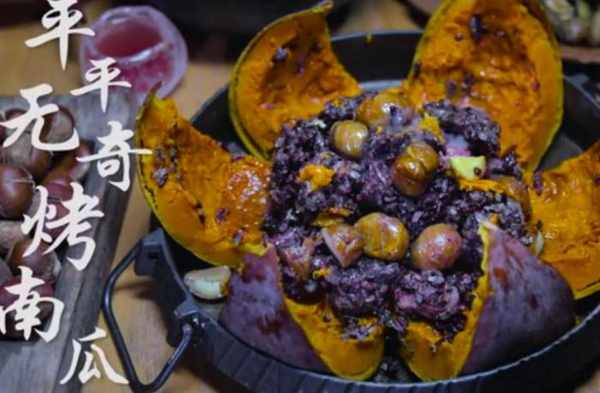 李子柒用南瓜做了一到烤南瓜,親手收的紫米,加入花生,紅棗,板栗等等,用大鐵鍋和自製的土烤爐做出來,畫面唯美,美味誘人,讓人一看就忍不住流口水。
