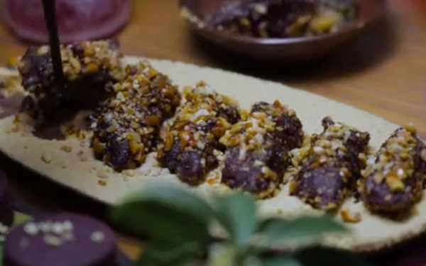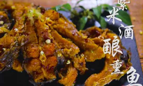 紫米酒熏魚,這道菜是用草魚來做的,看著李子柒熟練的把魚剁成塊,醃制好草魚塊炸直到酥脆,然後浸泡在她用自己釀的紫米酒做成的湯汁中,看看都滋味誘人。