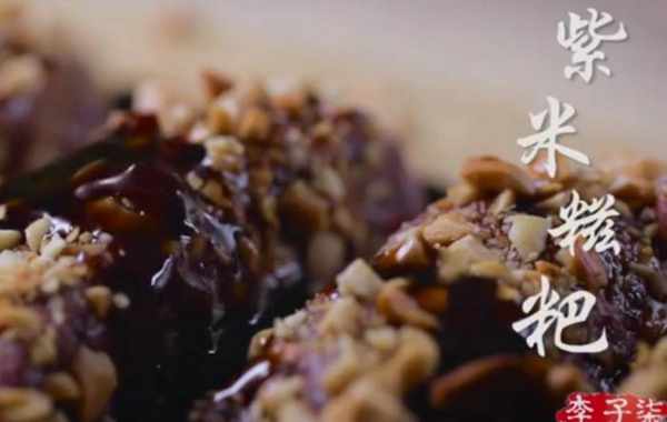 紫米糍粑,紫米是糯米的一種,看到的是李子柒打的年糕,做成糍粑,撒上花生碎,看起來就是好吃的樣子。
