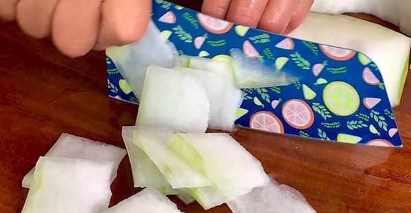 1、首先把買回來的冬瓜切掉外皮,再用小勺子把瓜瓤刮掉,接著把冬瓜切成薄片,稍微切的薄一點,這樣熟的也比較快,切好的冬瓜先放在一邊備用。