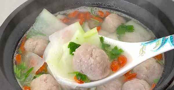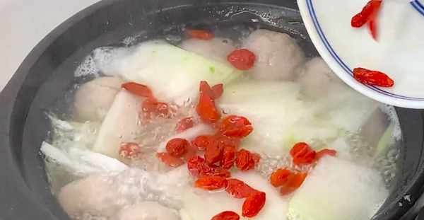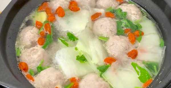 7、時間到瞭加入一點枸杞,煲瞭15分鐘,這個冬瓜也已經軟爛瞭,再往裡面加入適量的鹽,少許的香菜段,再次攪拌均勻就可以把火關掉瞭。一碗清甜解暑的冬瓜肉丸子湯就做好瞭。