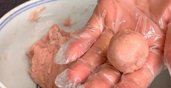 4、手中抹一層油,捏一點肉,團成圓形,全部團好以後就可以下鍋煲湯瞭。