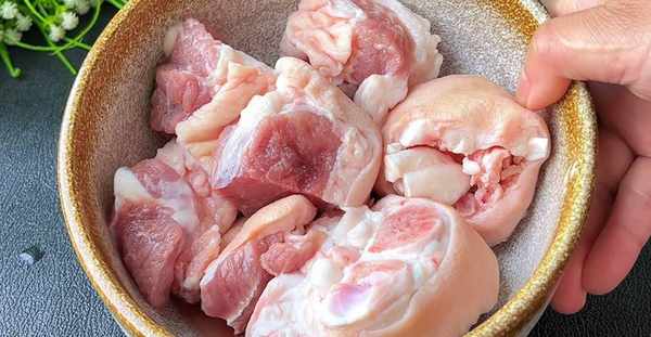 2、準備一些豬蹄和腿肉,冷水下鍋焯水,放入薑片,倒入一勺料酒去腥,用鏟子翻拌一下,再大火煮開,水開撇去浮末,把浮沫撇幹凈,再把豬蹄在鹽湯中清洗幹凈,就不要再過冷水瞭。