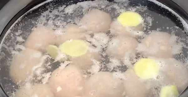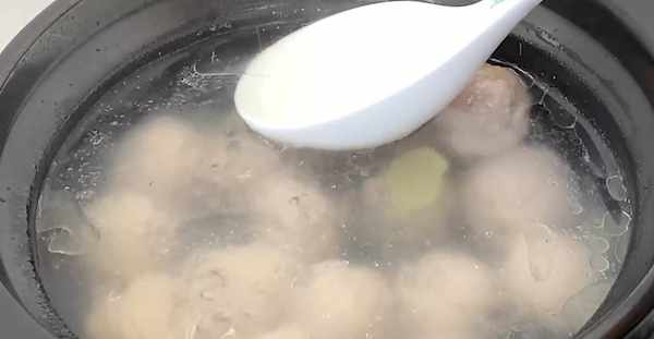 5、往砂鍋裡面加入清水,先用大火燒至微開,加入三塊的薑片,再輕輕的放入做好的丸子,蓋上鍋蓋,用小火先燉煮十分鐘。