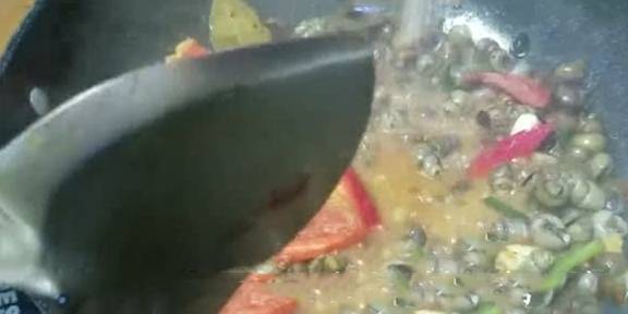 8、螺絲燜煮的時間到瞭,再把紅椒放入鍋中顛炒幾下,把它炒至斷生即可,再放點味精就可以出鍋瞭。