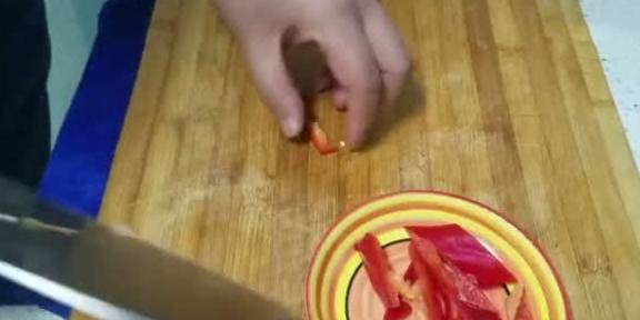 7、趁著煮螺絲的時間,我們把紅椒改刀切成菱形狀,目的是為瞭擺盤好看些而已,如果自己吃就沒哪些將就,怎麼切都行。