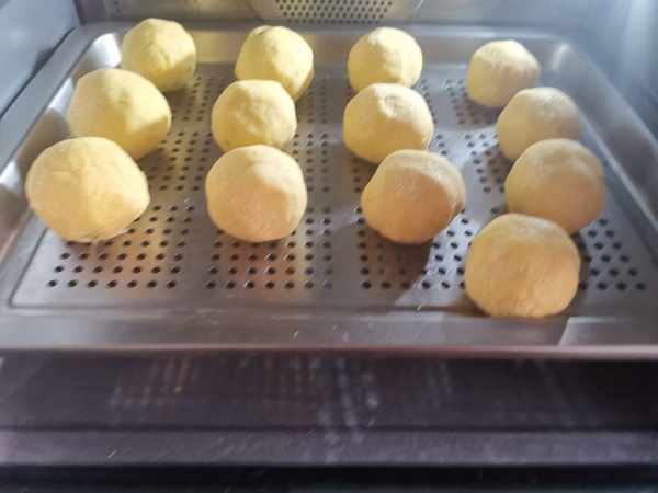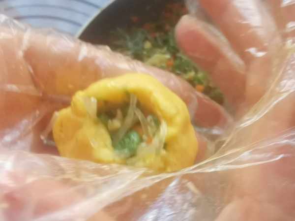 第三步:把玉米麵團分成小劑子,拿一個按扁,放上餡料,用手捏緊口,包好即成。