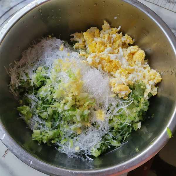 第二步:芹菜剁碎,粉絲泡發剁碎,雞蛋炒散,加入葱末,薑末,鹽,五香粉,花生油拌勻,餡料即成。