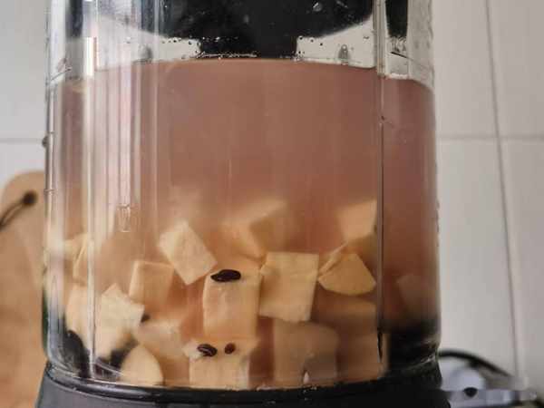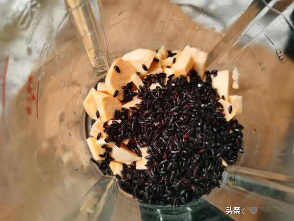 我們把紅薯去皮切成小丁,核桃仁2塊,黑米洗淨,一起放入到破壁機中。多放一些紅薯主要是為了新增味道以及口感。