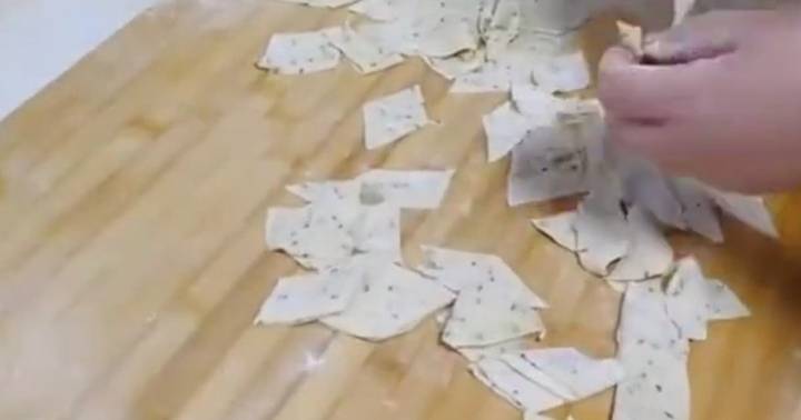 5、用刀再將搟成薄餅劃成長條,切成小塊備用;