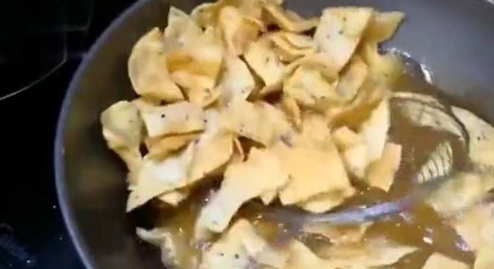 7、炸到九成熟的時候即可出鍋,出鍋後放涼,油先不要舀出來;