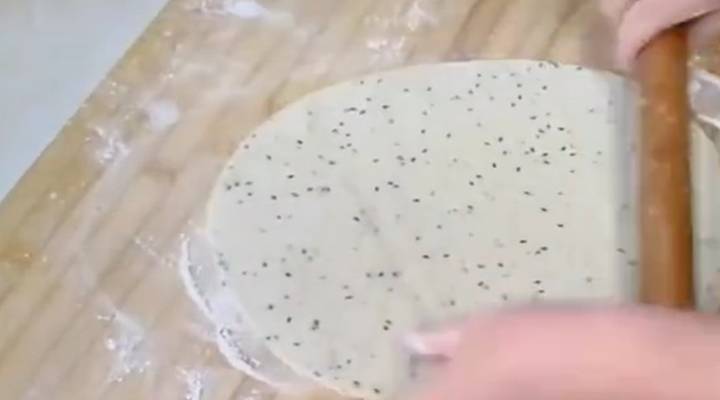 4、然後將面粉、土豆粉、雞蛋一起攪拌均勻,再揉成面團,註意揉面不要揉的太軟瞭,稍微硬點好,然後將面團用搟面棒搟成一個圓餅狀,越薄越好;