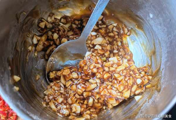第六步:把調好的蒜末用勺子舀到海蠣子肉上。