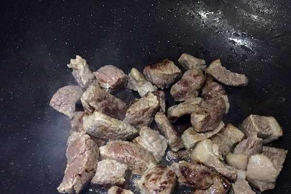 2、鍋燒熱,加入少量的油(重口味多加油)加入牛腩翻炒,炒至表面上色。
