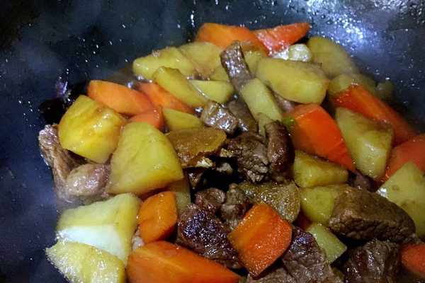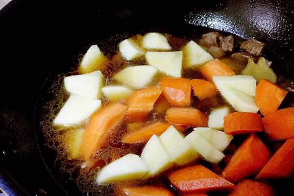 4、小火慢燉1小時左右直到牛腩煮爛。加入土豆和胡蘿卜,大火燒轉中火,等土豆和胡蘿卜煮熟後轉大火收汁。