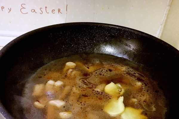 3、加入八角和生薑繼續翻炒3分鐘(喜歡麻辣的朋友就加辣椒等),加入鹽、黃酒、生抽、老抽、冰糖等翻炒均勻,加入開水煮開後轉小火。