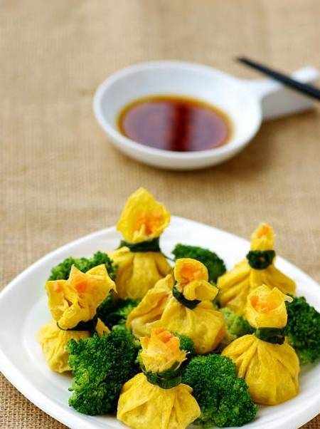 6,一份蛋皮切4片,取一片包入適量餡料,用燙軟的蔥葉紮口,排放碟上,隔水蒸10分鐘左右,淀粉加水和剩餘油加熱調成芡汁,淋在石榴雞上即可。