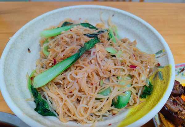 新鮮買來的米粉用水浸泡一會兒,撈出瀝幹水,鍋裡放油,先把雞蛋煎熟,撈出雞蛋,留底油,加入蒜頭爆香。加入瀝幹的米粉翻炒,加老抽、生抽、蠔油調味,加少許辣椒粉,加少許上海青,這樣炸出來的粉絲,爽滑爽口。