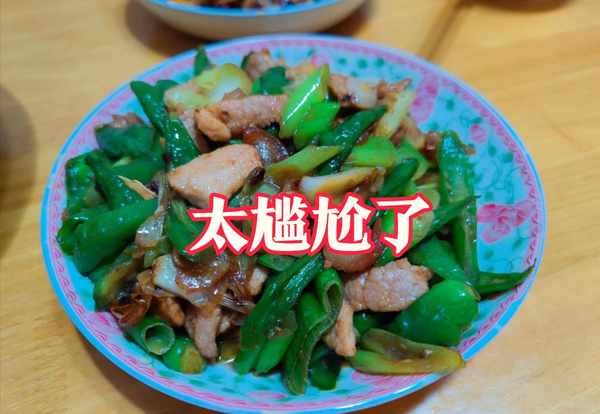 鍋內留底油,下青椒爆香,下蔥,倒入瘦肉繼續炒,加生抽、蠔油、雞精調味,同時翻炒,然後它就會從鍋裡出來。