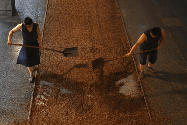 手工班釀造車間,工人正在出甄降溫,儲永志/攝