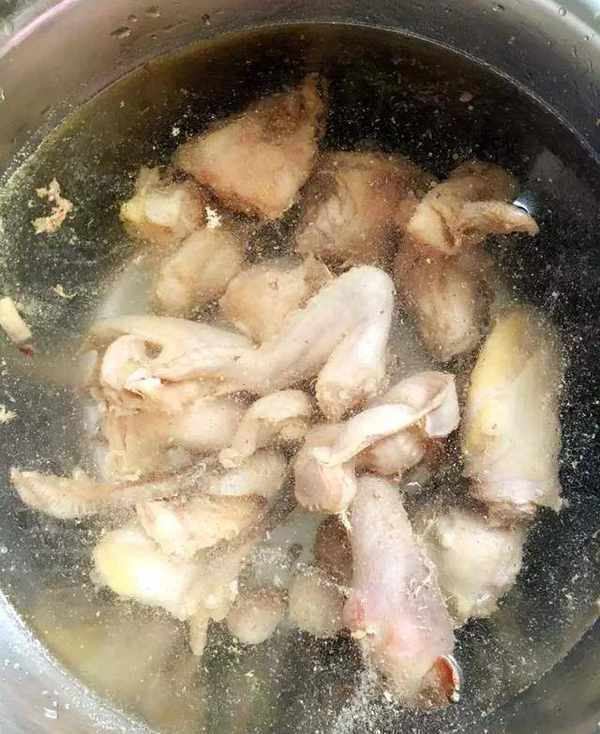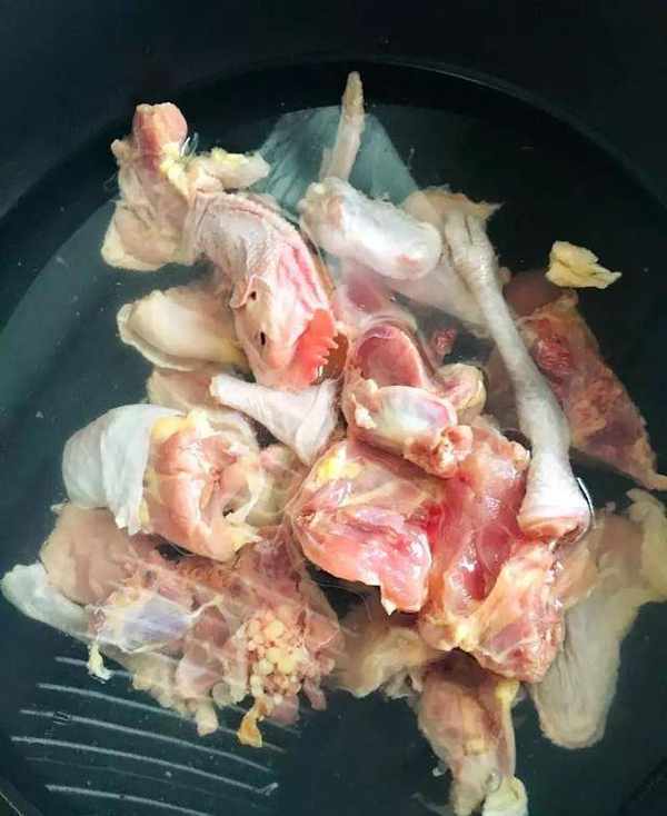 1、雞去毛去內臟去雞屁股洗凈切小塊,放入鍋中,加水煮至出來浮沫