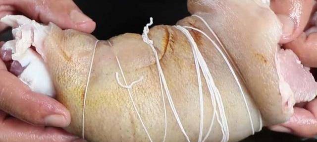然後把豬蹄稍微用力卷起來,卷成圓柱形狀。最後用一條幹凈的繩子,把豬蹄緊緊的綁起來。(豬蹄對於經常四肢疲乏,腿部抽筋、麻木,消化道出血,失血性休克及缺血性腦病患者一定輔助療效,它還有助於青少年生長發育和減緩中老年婦女骨質疏松的速度)。
