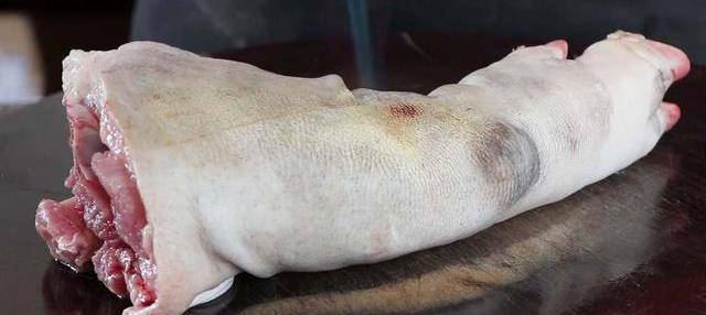 制作白切豬手,到鮮肉店買一塊顏色新鮮正經的豬蹄,最好選豬前蹄。先把豬蹄上的毛用火焰槍噴燒至盡,去掉蹄甲,放入清水中,用刀把燒焦的毛刮完,清洗幹凈,瀝幹表面水分。