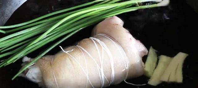 把綁好的豬蹄放進鍋中,加入料酒、蔥花、沒過豬蹄的清水。先用大火煮開,然後轉小火燜一個小時。中間註意翻動幾次。在水開以後,撇去上面的浮沫。煮好以後,夾出豬蹄放到涼開水中降溫備用。