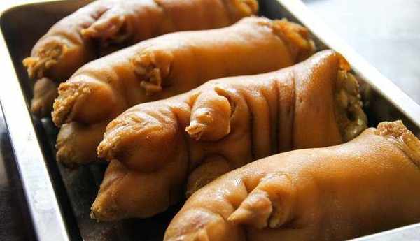 預處理:拔凈殘毛,用明火燎去細毛及趾間絨毛,用刀修去殘垢後,冷水浸泡排出血水,去掉蹄殼,沖洗幹凈備用。