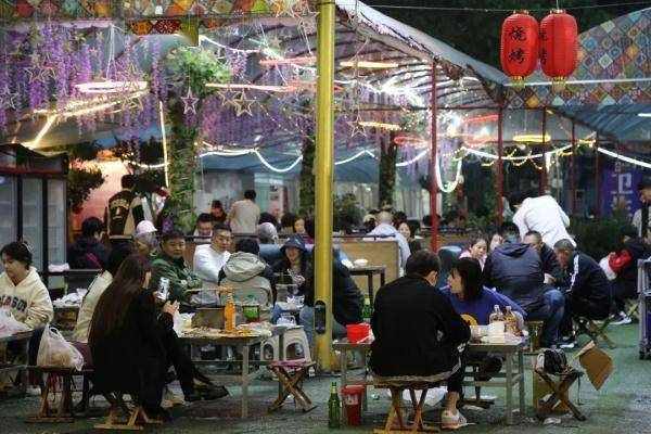 火爆的還有各種特色小吃。“八大局燒烤”附近的“愉悅大排檔”,煙火升騰,花生、毛豆、田螺、小海鮮等,琳瑯滿目。馬路邊、大樹下、院子裡,簡易的小方桌,人們在城市的角落,尋找犒勞自己胃口的地方,或飲或食,或說或笑。