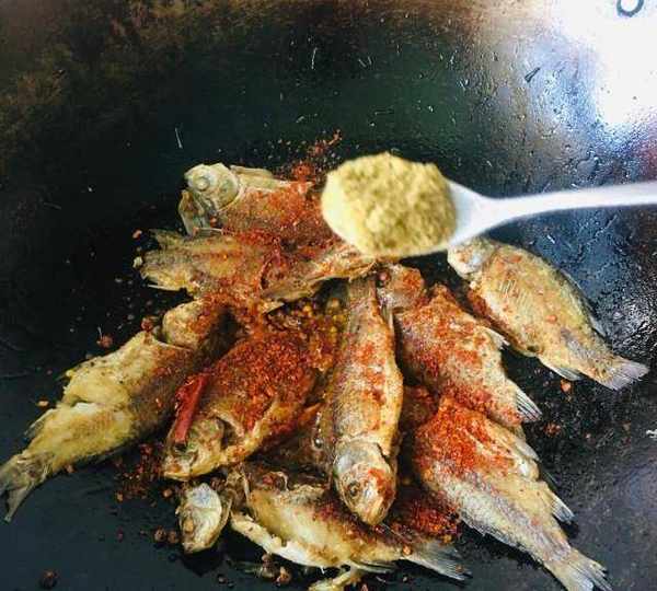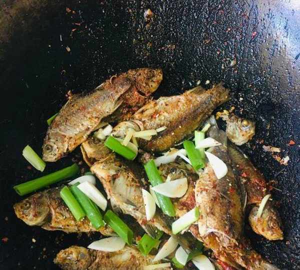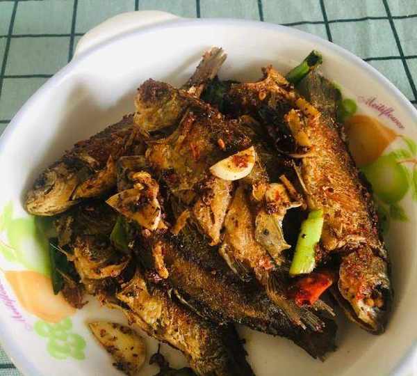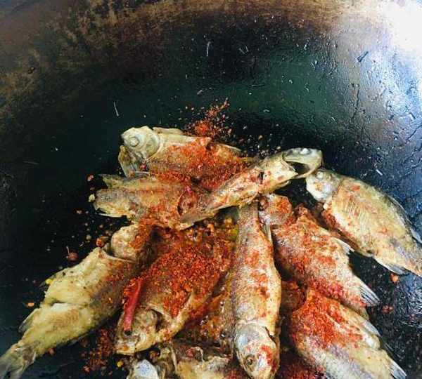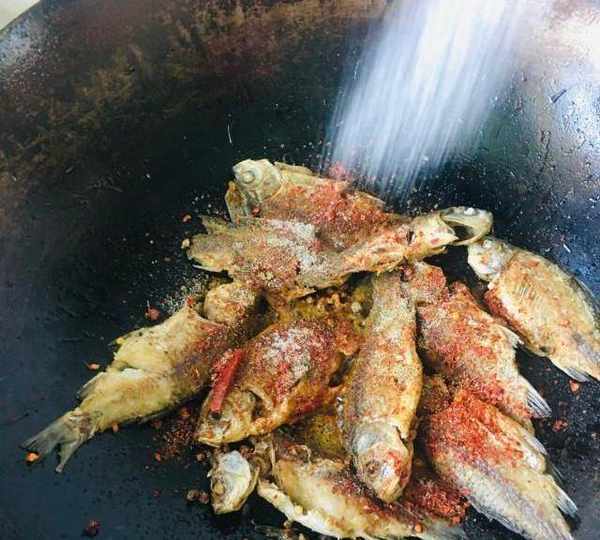 原料:鯽魚、蔥、薑、蒜、鹽、花椒粒、辣椒面、孜然粉、幹辣椒段。