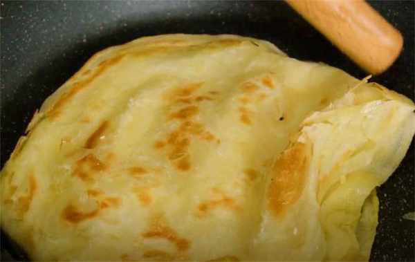 8.平底鍋中火預熱好少刷一些油,放入餅坯,蓋上蓋子烙大概40秒左右,看到餅顏色變深的時候記得翻面,然後多晃動一下鍋底確保餅受熱均勻,期間用鏟子擠壓幾次這樣有助於出層,現在就能感覺到這個餅真的特別柔軟,等烙至餅鼓起兩面金黃時就可以準備出鍋瞭。