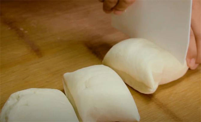 3.面團餳好之後千萬不要揉,直接整理成長條,切成四個劑子。