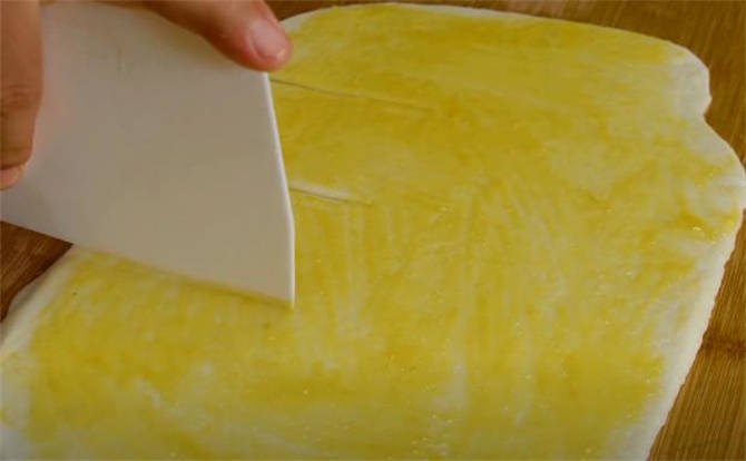 4.案板上少抹一些油防粘,把面團按扁按開,搟成長方形,中間均勻的塗抹一層油酥,油酥不要塗抹得太多適量就可以,然後用刮板分成八份,最後兩份要大一些。