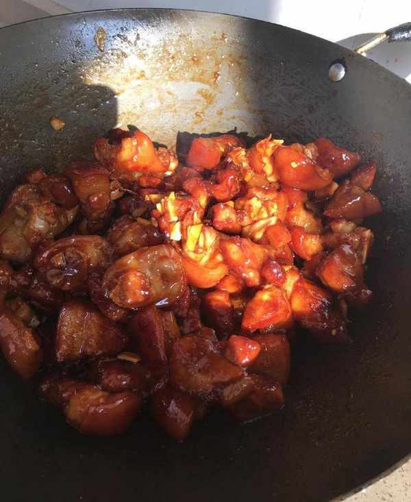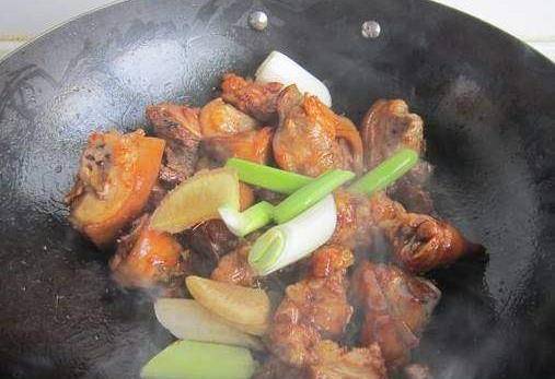 2、油鍋下冰糖,,炒糖色,紅燒醬油邊炒翻色,