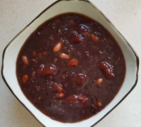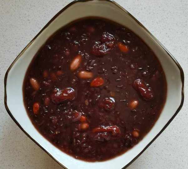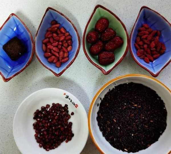 原料:紅皮花生米、紅棗、枸杞、紅豆、血糯米、紅糖、清水、油。