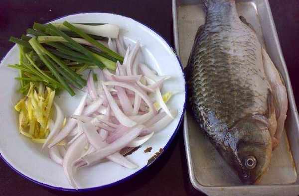 材料:鯽魚、薑絲洋蔥、香菜、蔥、橄欖油