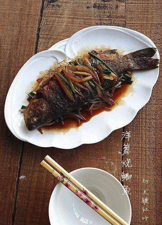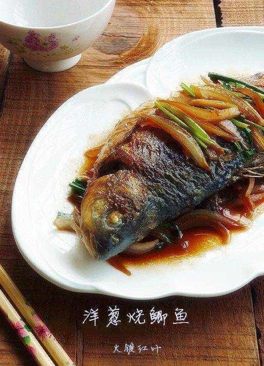 洋蔥燒鯽魚是道好吃傢常菜,用橄欖油煎魚效果很好,溫度不算高就煎的非常漂亮瞭,鮮嫩的魚肉,配搭惹味的洋蔥,加上是用橄欖油煎的,吃瞭美上加美