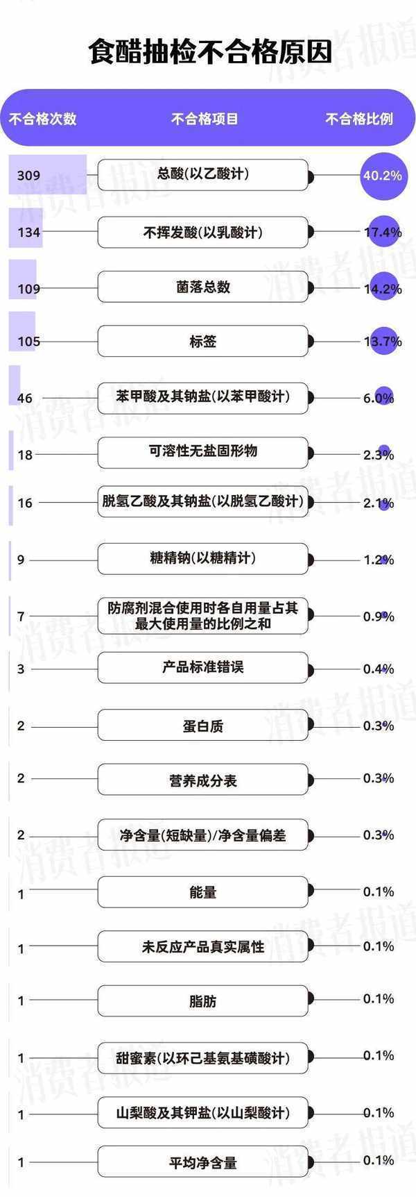從原因看,此次食醋抽檢不合格原因主要涉及品質指標不達標、衛生指標不達標、超量或超范圍使用防腐劑或甜味劑等方面。其中總酸、不揮發酸和菌落總數是食醋不合格的重災區,三者占比71.9%。