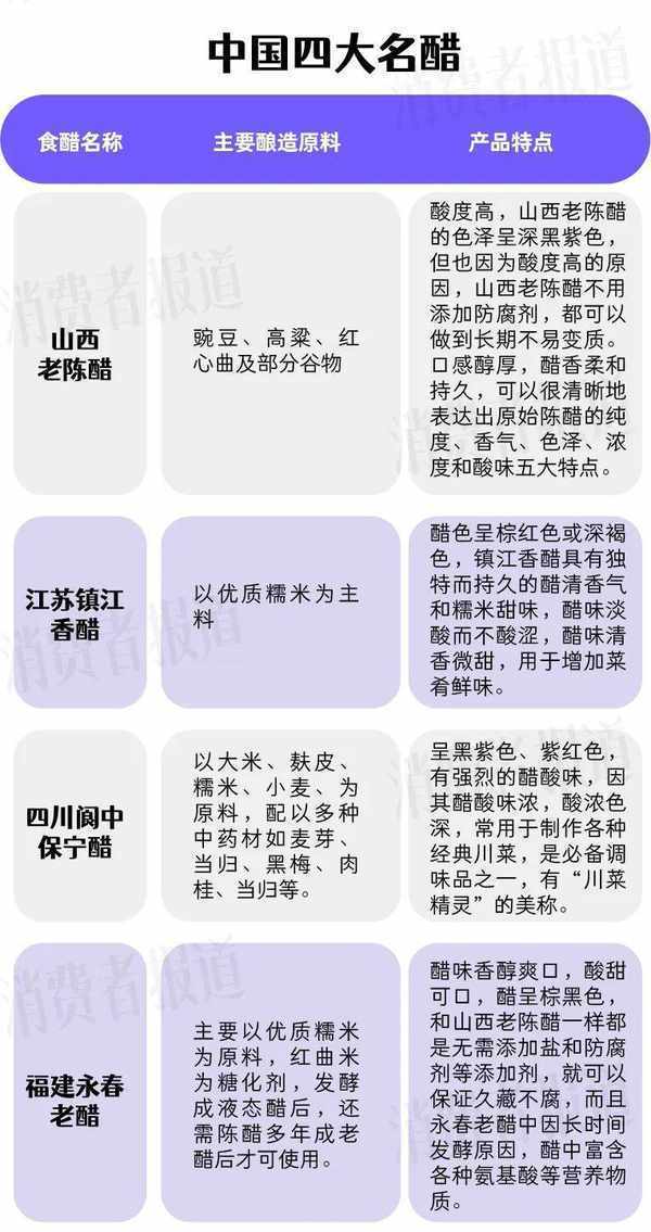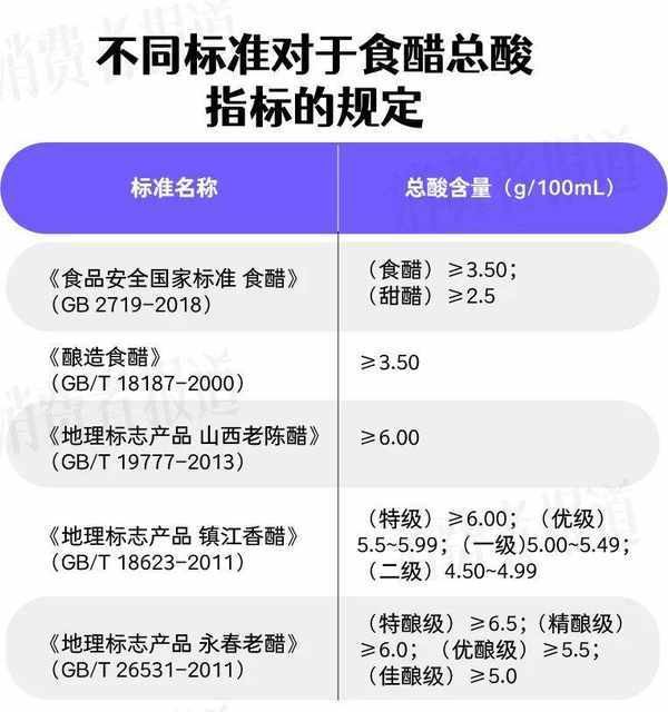 《消費者報道》記者對比瞭不同標準食醋在總酸指標上的差異,鎮江香醋、永春老醋均是以“總酸”作為質量分級的依據之一,總酸含量越高,質量等級越高。