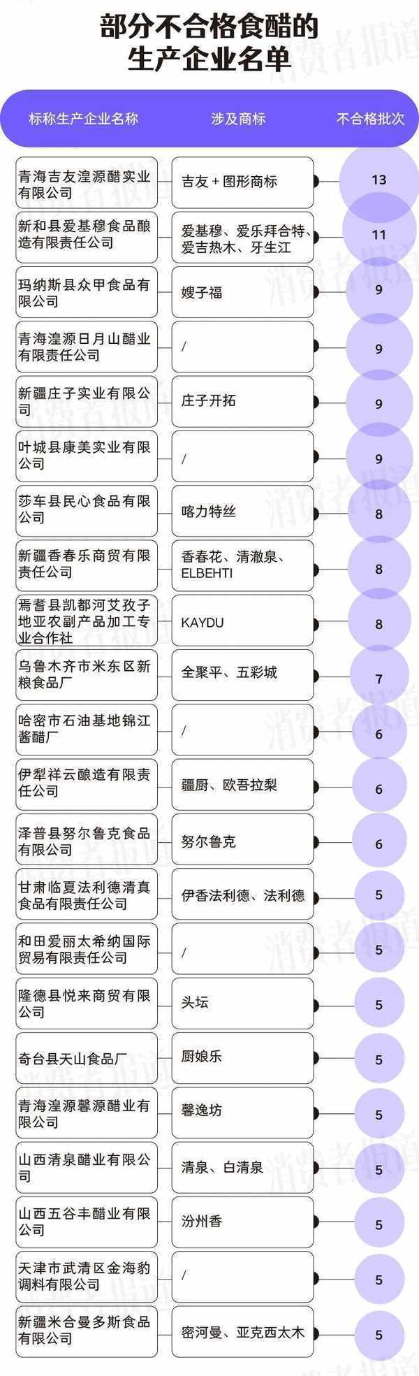 品牌方面,近五年上榜次數最多的食醋生產廠傢高達13次,是青海吉友湟源醋實業有限公司,其生產的10批次食醋標簽不合格,2批次食醋總酸不達標,1批次宣稱“不添加任何防腐劑”的湟源老醋王(釀造食醋)檢出苯甲酸及其鈉鹽。其次是新和縣愛基穆食品釀造有限責任公司,其生產的11批次食醋涉及標簽、不揮發酸、凈含量、總酸、菌落總數、脫氫乙酸及其鈉鹽不合格。